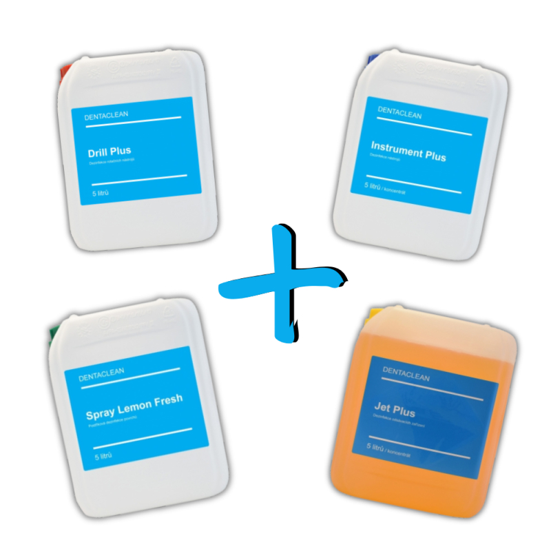 Set obsahuje: 1 x Dentaclean JET 5L, 1 x Dentaclean Instrument Plus 5L, 1 x Dentaclean Drill Plus 5L, 1 x Dentaclean Spray Lemon Fresh 5L